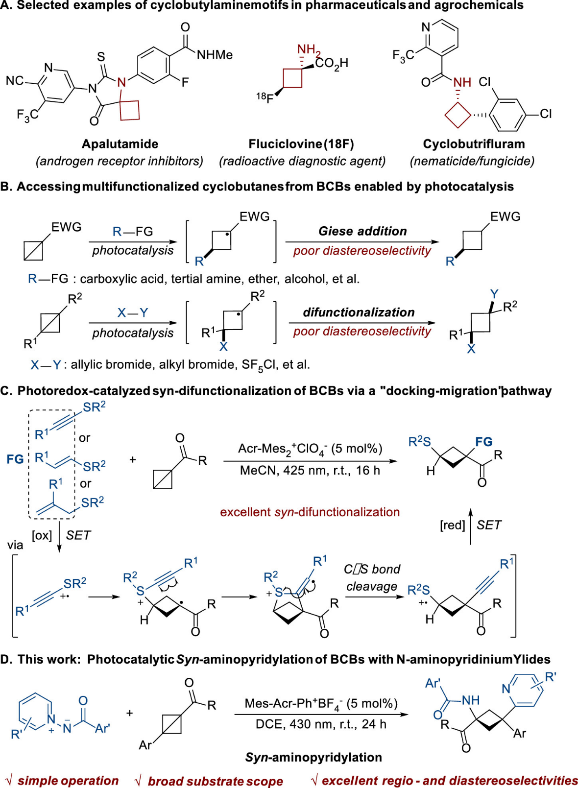近日,南京农业大学邓红平教授与新加坡国立大学吴杰教授在Precision Chemistry上合成报道了光致氧化还原催化双环[1.1.0]丁烷与N-氨基吡啶鎓叶立德的区域及非对映选择性胺化-吡啶化的研究。本文基于“对接-迁移”的策略,利用N-氨基吡啶鎓叶立德为双官能团化试剂,发展了一种新型的可见光介导双环[1.1.0]丁烷(BCBs)的顺式胺化-吡啶化的合成方法,以优异的区域选择性和非对映选择性合成一系列环丁胺衍生物(图2)。