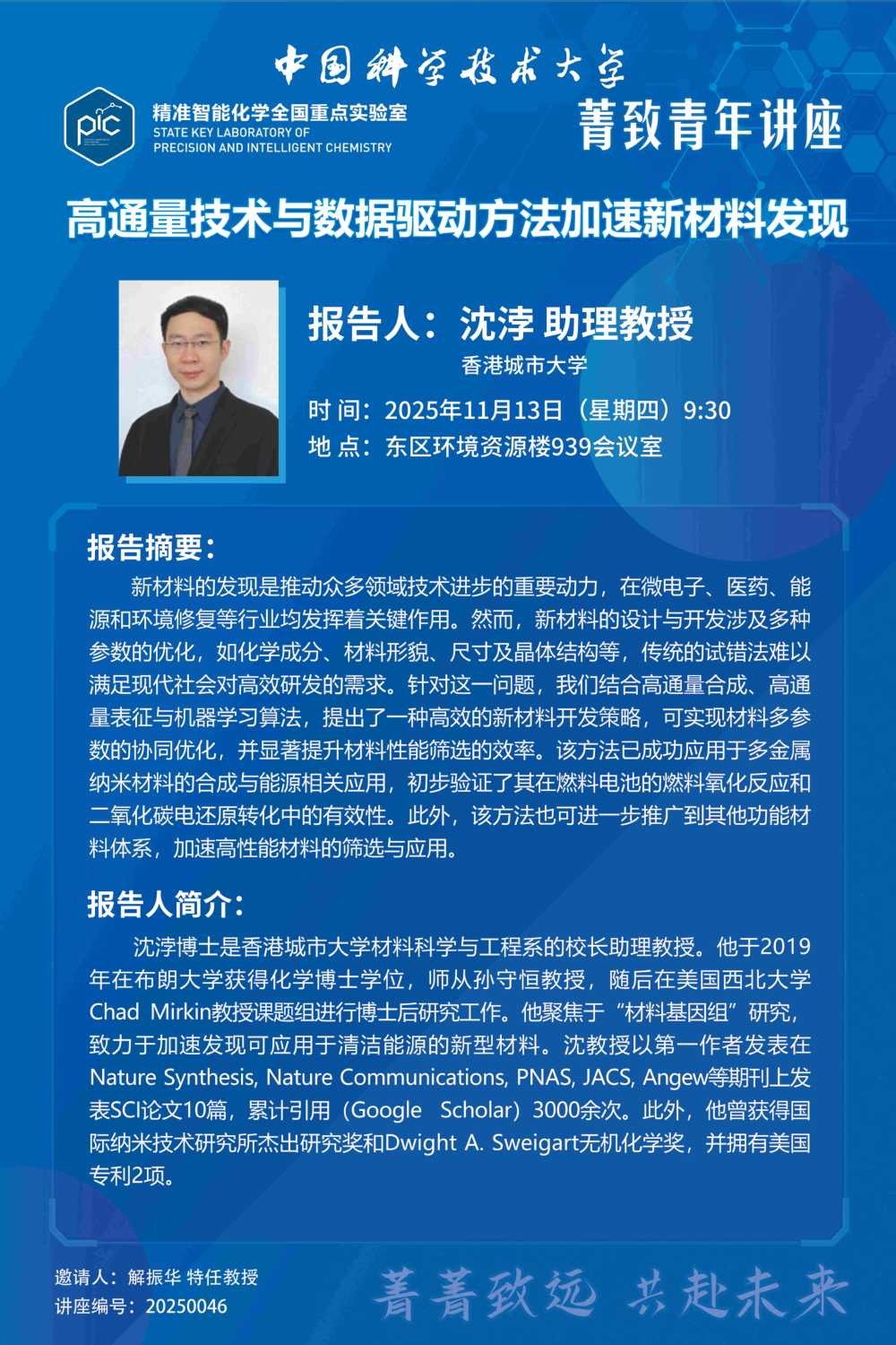 报告人简介 | 沈浡博士是香港城市大学材料科学与工程系的校长助理教授。他于2019年在布朗大学获得化学博士学位,师从孙守恒教授,随后在美国西北大学Chad Mirkin教授课题组进行博士后研究工作。他聚焦于“材料基因组”研究,致力于加速发现可应用于清洁能源的新型材料。沈教授以第一作者发表在Nature Synthesis, Nature Communications, PNAS, JACS, Angew等期刊上发表SCI论文10篇,累计引用(Google Scholar)3000余次。此外,他曾获得国际纳米技术研究所杰出研究奖和Dwight A. Sweigart无机化学奖,并拥有美国专利2项。 |