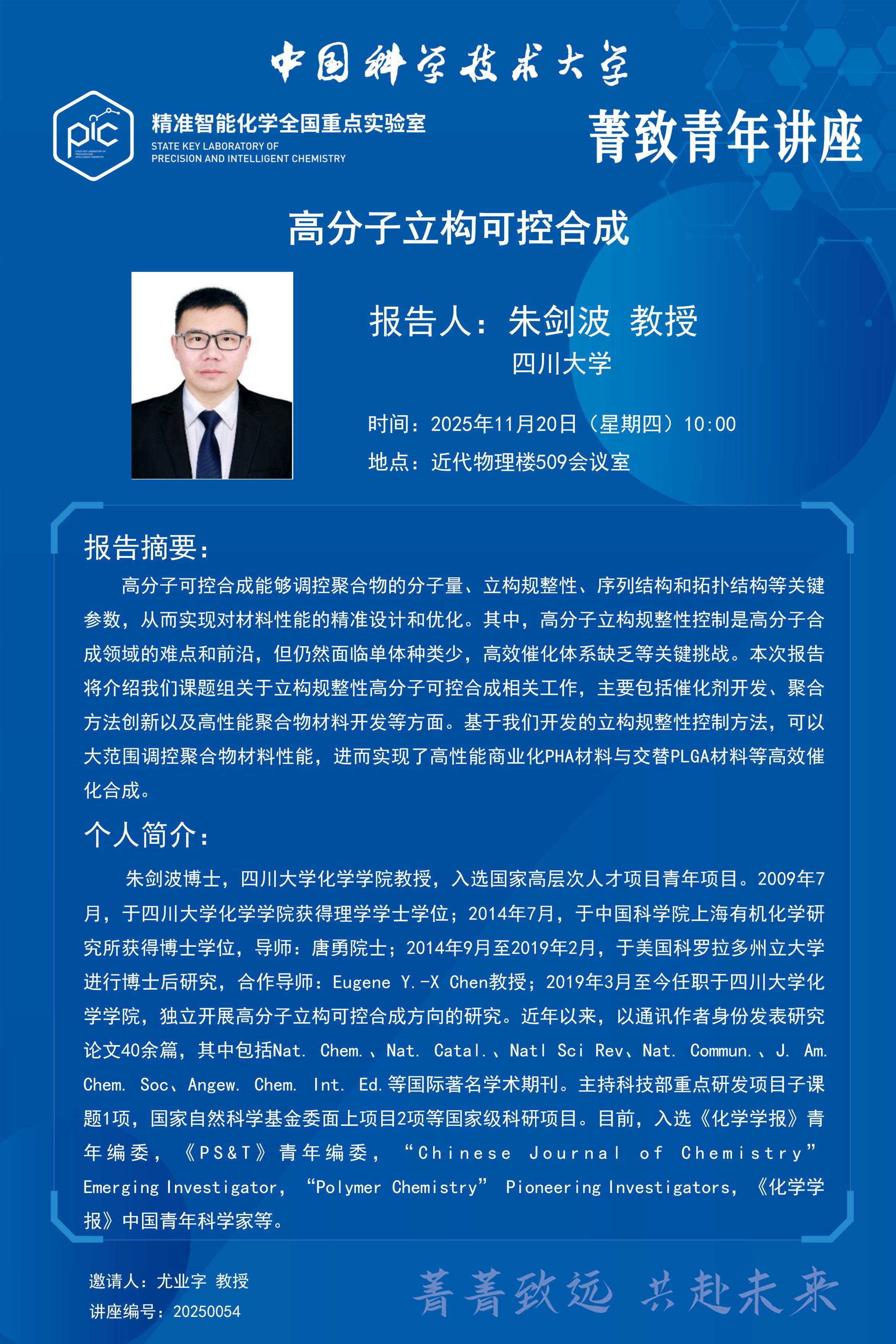 报告人简介 | 朱剑波博士,四川大学化学学院教授,入选国家高层次人才项目青年项目。2009年7月,于四川大学化学学院获得理学学士学位;2014年7月,于中国科学院上海有机化学研究所获得博士学位,导师:唐勇院士;2014年9月至2019年2月,于美国科罗拉多州立大学进行博士后研究,合作导师:Eugene Y.-X Chen教授;2019年3月至今任职于四川大学化学学院,独立开展高分子立构可控合成方向的研究。近年以来,以通讯作者身份发表研究论文40余篇,其中包括Nat. Chem.、Nat. Catal.、Natl Sci Rev、Nat. Commun.、J. Am. Chem. Soc、Angew. Chem. Int. Ed.等国际著名学术期刊。主持科技部重点研发项目子课题1项,国家自然科学基金委面上项目2项等国家级科研项目。目前,入选《化学学报》青年编委,《PS&T》青年编委,“Chinese Journal of Chemistry” Emerging Investigator,“Polymer Chemistry” Pioneering Investigators,《化学学报》中国青年科学家等。 |