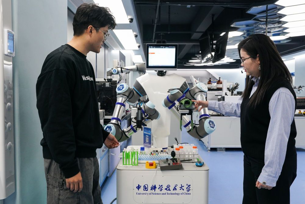 2025年11月24日,中国科学技术大学精准智能化学全国重点实验室特任教授朱濯缨(右)与博士生郭露露在“机器化学家”小临前进行业务探讨。