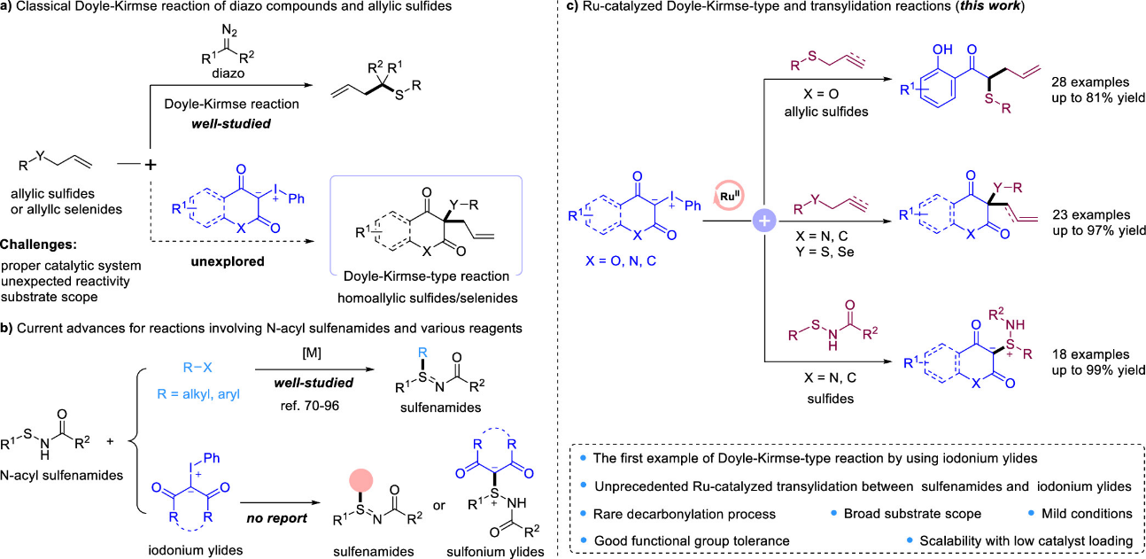 过渡金属催化的卡宾转移反应已成为构建碳-杂键及分子骨架重构的高效方法,其中 Doyle-Kirmse 反应通过重氮化合物与烯丙基硫醚的金属卡宾介导过程,经硫鎓叶立德形成与 [2,3]-σ 迁移重排,为碳-碳、碳-硫/硒键构筑及高烯丙基硫(硒)化物合成提供了重要途径。该反应通常依赖重氮化合物作为卡宾前体,但此类化合物的不稳定性、毒性及易爆性带来显著安全隐患,开发更安全的替代前体成为研究热点。同时,硫醚、苯并噻吩等含硫(硒)化合物广泛存在于药物、材料及天然产物中,硫鎓叶立德作为关键中间体在环化、亲核反应中具有重要应用,而碘叶立德虽在金属介导反应中展现丰富反应活性,其在 Doyle-Kirmse 类型反应及叶立德转移反应中制备硫鎓叶立德的应用仍有待开发,且存在催化体系效率、选择性调控及底物适用范围等挑战。此外,N- 酰基硫代磺酰胺与多种试剂的反应已用于亚磺酰亚胺合成,但与碘叶立德的反应尚未见报道。基于此,本研究开发了钌催化体系:以稳定的碘叶立德替代重氮化合物,通过 Doyle-Kirmse 类型反应结合罕见的脱羰过程,实现高烯丙基 / 联烯基硫(硒)化物的发散合成;同时本研究还首次报道 N-酰基硫代磺酰胺与碘叶立德的钌催化叶立德转移反应,在温和条件下高效制备硫鎓叶立德,为含硫(硒)功能分子的安全构筑提供了新策略(图1)。