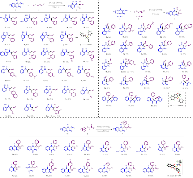 该反应以碘叶立德和烯丙基/炔丙基硫(硒)醚或N-酰基磺胺为原料,在[RuCl2(p-cymene)]2催化下,经关键的钌卡宾中间体,分别经由Doyle–Kirmse、脱羰途径或叶立德转移途径,发散性地获得不同产物。在最优反应条件下,作者对碘叶立德、烯丙基/炔丙基硫(硒)醚及N-酰基磺胺这三类底物进行了系统考察(图2)。结果表明,该策略具有优异的底物普适性与官能团耐受性。各类给电子或吸电子基取代的碘叶立德、脂肪族/芳香族/杂环取代的硫(硒)醚,以及不同保护的N-酰基磺酰胺,均能顺利参与转化,以中等至优秀的收率获得目标分子。