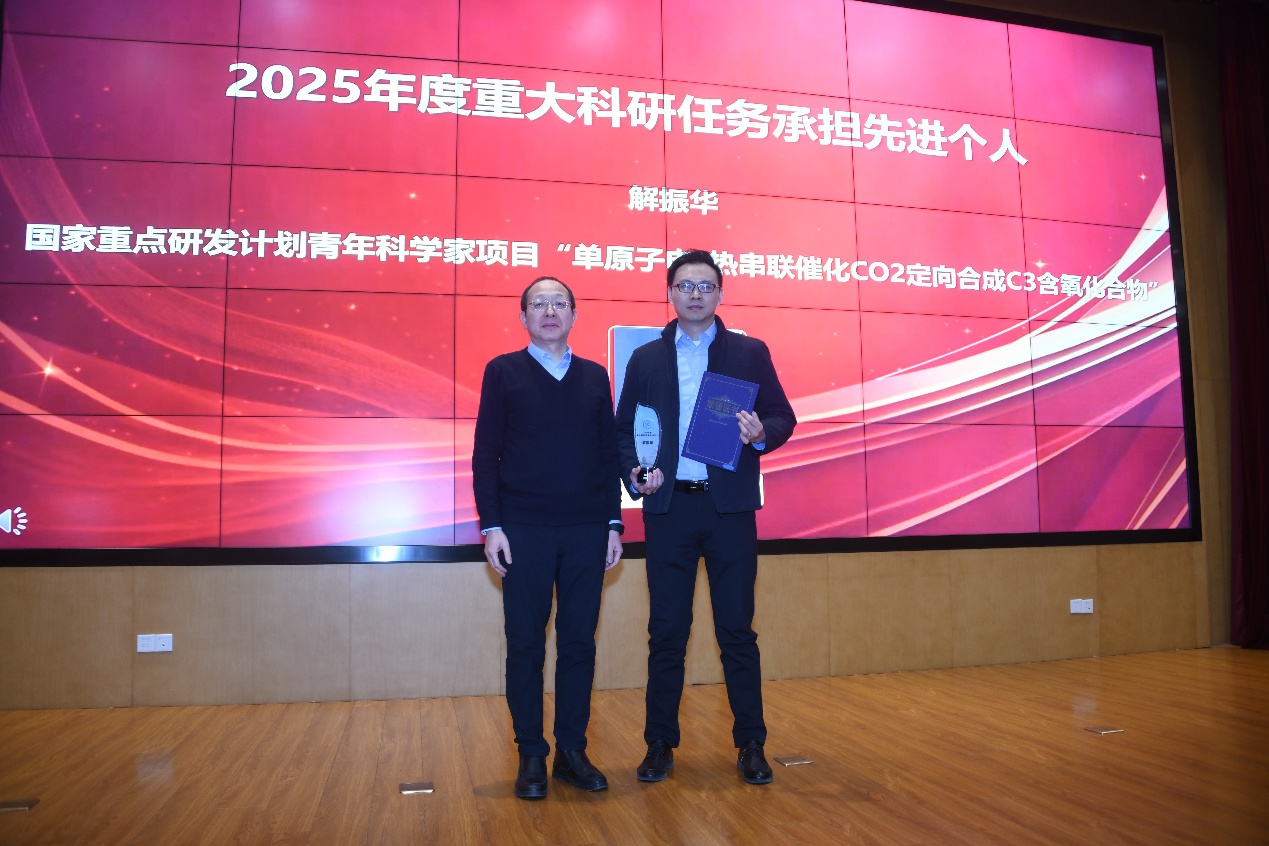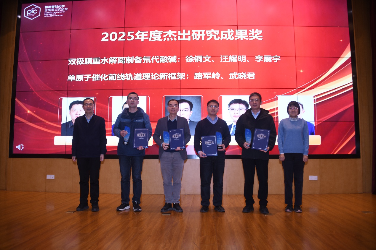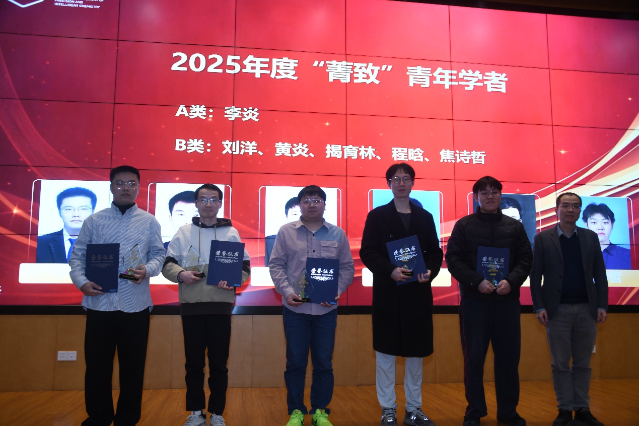 大会还对2025年度在科研工作中表现突出的团队与个人进行了表彰。“双极膜重水解离制备氘代酸碱”与“单原子催化前线轨道理论新框架”两项成果获2025年度杰出研究成果奖,谢毅院士和杨金龙院士为获奖团队颁奖。随后刘世勇院长为2025年度重大科研任务承担先进个人颁奖,李震宇主任为2025年度“菁致”青年学者颁奖。