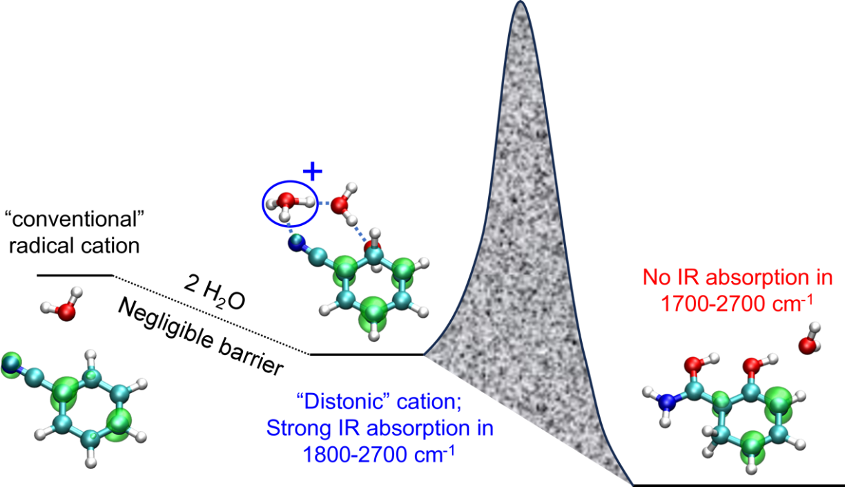自由基与水分子的相互作用广泛存在于生命体系和浩瀚的星际空间中。这类相互作用对理解生命起源和早期有机分子的演化至关重要。近年来,天文学家已在星际介质中明确探测到苯腈分子,这种含氮芳香化合物可能是生命前体物质的关键线索。因此,研究苯腈自由基阳离子(BN•⁺)逐步结合水分子的过程,不仅有助于揭示功能化芳香分子在含水环境中的行为,也为探索星际化学中复杂有机物的形成路径提供了窗口。