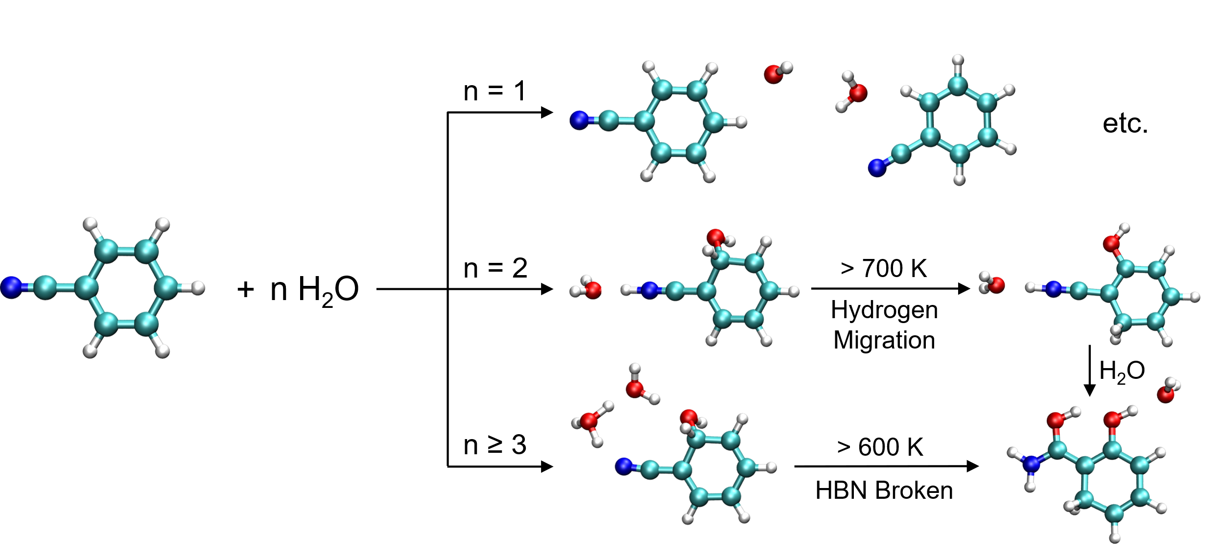通过“漏斗式”迭代分步构型搜索以及过渡态计算,研究团队在高精度理论水平下(采用XYGJ-OS双杂化密度泛函及DLPNO-CCSD(T) 波函数方法)确定了BN•⁺在不同条件下逐步水合过程中的热力学和动力学稳定结构(图1)。具体来说,当水合数n=1时,BN•⁺仅通过较弱的非共价作用与水分子形成一种典型的自由基阳离子-水复合物。高精度理论计算确定了所有5种稳定结构,其能量差不超过1.5 kJ/mol。在常温下,一旦与第二个水分子碰撞,会触发“水助亲核加成”。此时,一个水分子进攻BN•⁺中的邻位碳,发生加成反应,使该邻位碳由sp2杂化转变为sp3杂化;同时,质子由另一水分子转移至氰基(–C≡N)的氮原子上。随着进一步水合(n≥3),转移出的质子会被周围水分子重新捕获,形成一种动力学稳定的由自由基中心与一个质子化的水团簇通过氢键构成环状结构。在较高温度下,这些动力学稳定产物还会发生水分子协助的氢迁移。例如,当温度超过700 K时,n=2的复合物中邻位碳上连有羟基(–OH)的氢原子会迁移到另一个邻位碳上。当n≥3时,发生该氢迁移过程所需的温度可降至约600 K。在高温下,随着n的增加,氰基中的氮原子被氢化,最终生成含氨基(–NH2)的热力学稳定产物。