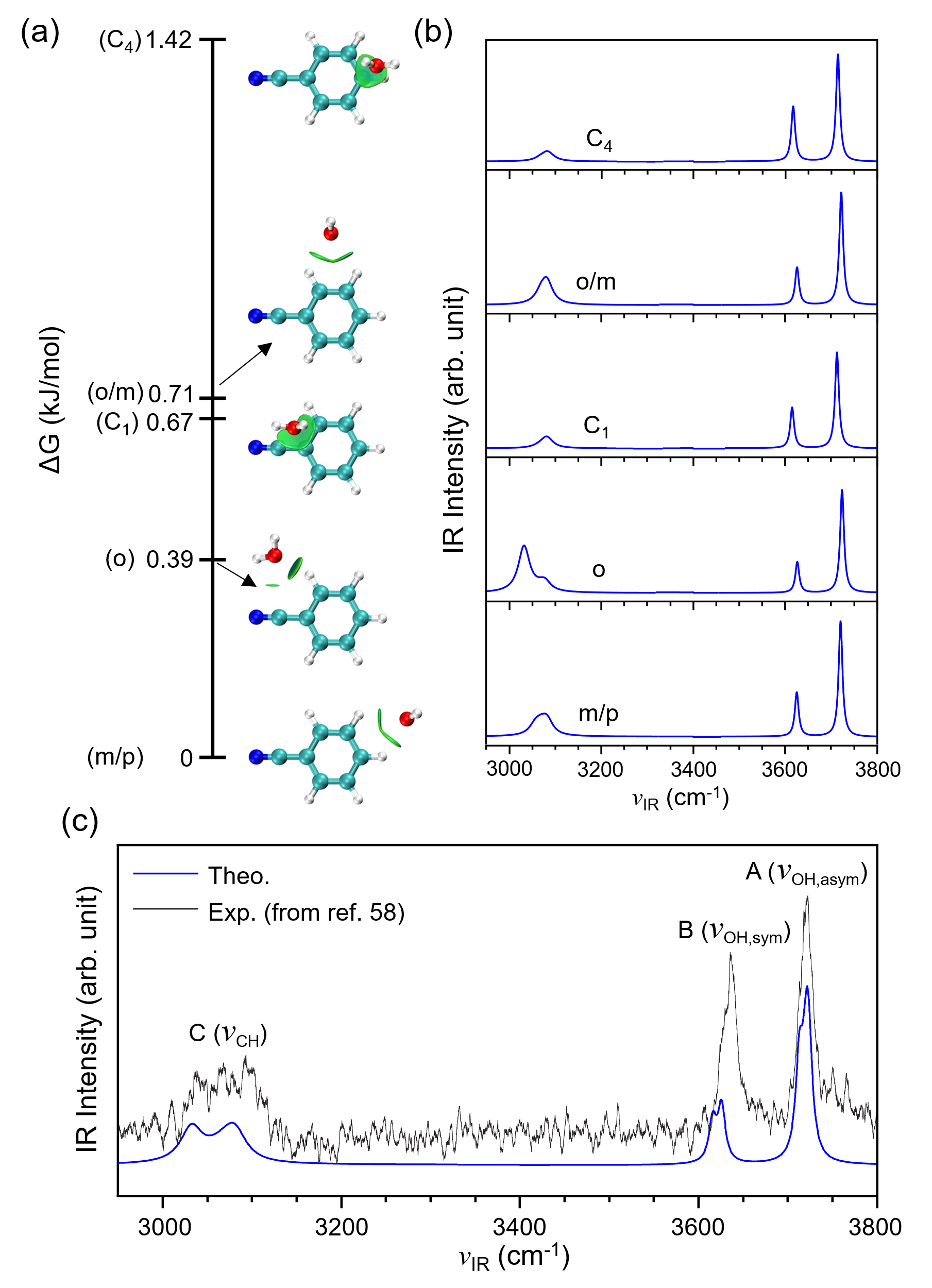 上述高精度理论级别下得到的BN•⁺逐步水合过程中的结构变化与已有的实验测量完全吻合。例如,对于BN•⁺单个水分子复合物,水分子主要通过两类位点与苯腈结合,一类是氰基α-碳及对位碳原子,另一类是氢原子(图2a)。在后一类中,研究团队新发现的o-构型尤为重要。由于该构型中水主要和邻位的碳形成C–H⋯O单弱氢键,而非其他构型(m/p和o/m)中的弱双氢键,其C–H伸缩振动在红外光谱中表现出显著的红移和峰形展宽(图2b)。这一光谱特征使得高精度双杂化密度泛函理论预测的Boltzmann权重平均红外光谱
