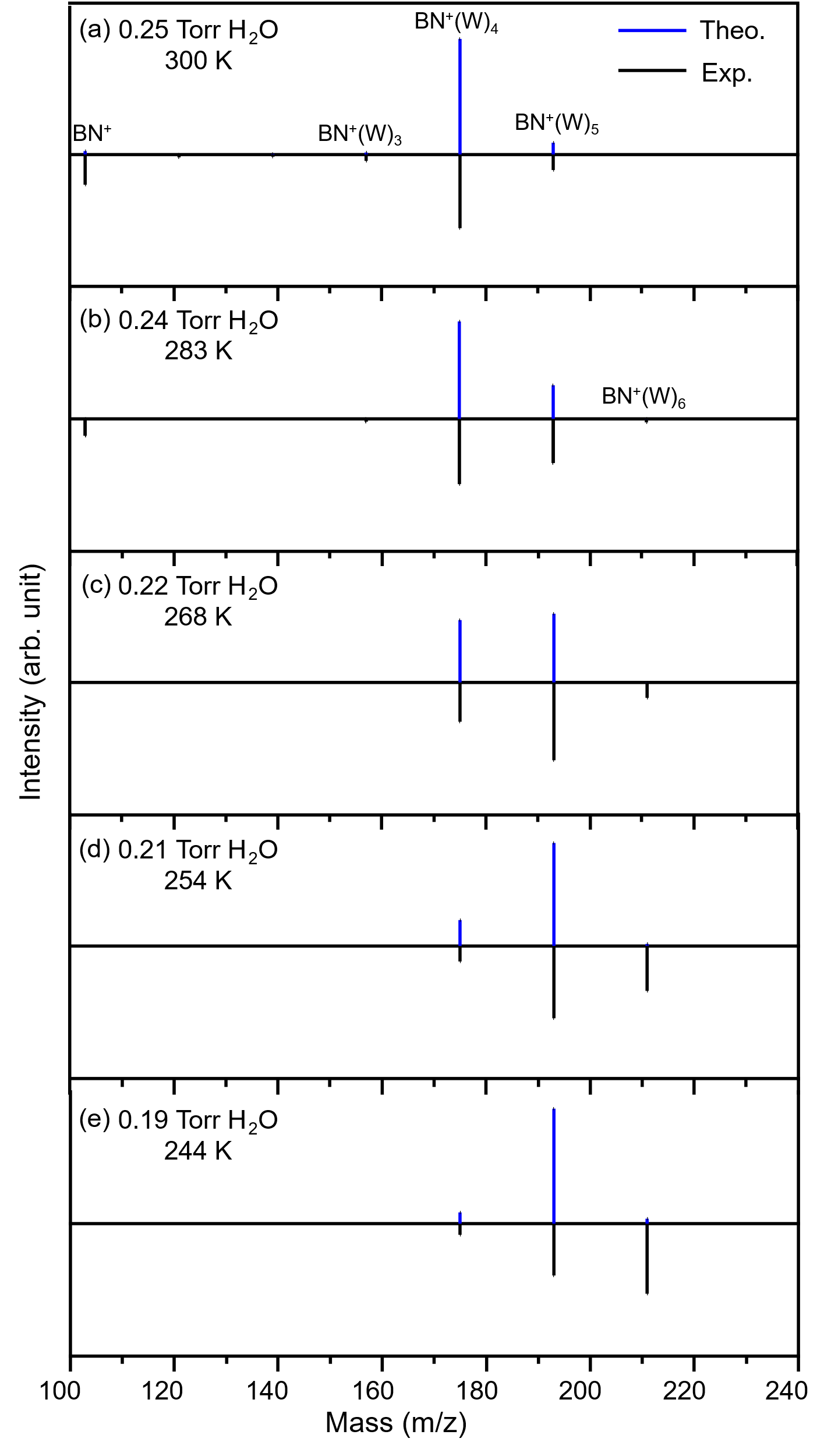 目前,科学家已利用高分辨谱学技术对这一过程展开了细致研究。例如,研究人员成功测得了BN•⁺与单个水分子形成的复合物的红外光谱。同时,通过质谱手段,也系统观测了其逐步水合过程中不同水合数团簇的丰度分布。有趣的是,质谱测量表明,水分子数目n≤3的复合物在多种实验条件下仅以痕量形式存在。这一现象促使研究者提出了一种“水助质子转移”机制来解释观测结果。