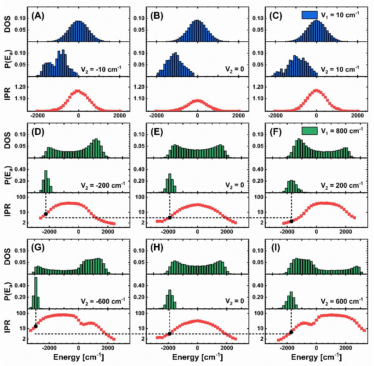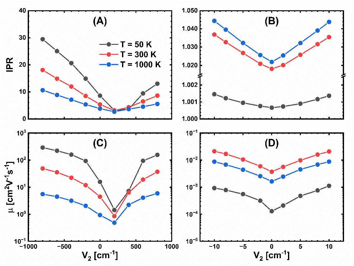 图2. 离域化程度(IPR)和迁移率(μ)随次近邻相互作用(V2)变化的关系图:(A, C)最近邻激子耦合V1 = 800 cm-1,(B, D)V1 = 10 cm-1