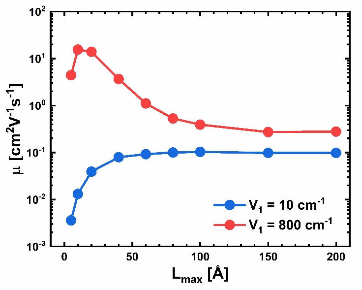 如图4所示,我们进一步扩大激子的相互作用范围,发现了一些普遍存在的物理规律。对弱耦合体系,扩大相互作用范围能显著提升激子迁移率;然而对于强耦合体系,长程相互作用反而会大幅降低激子迁移率。这确证了长程相互作用的“双重效应”,并凸显了其在决定有机半导体激子传输效率中的关键作用,为材料设计提供了重要的理论依据。