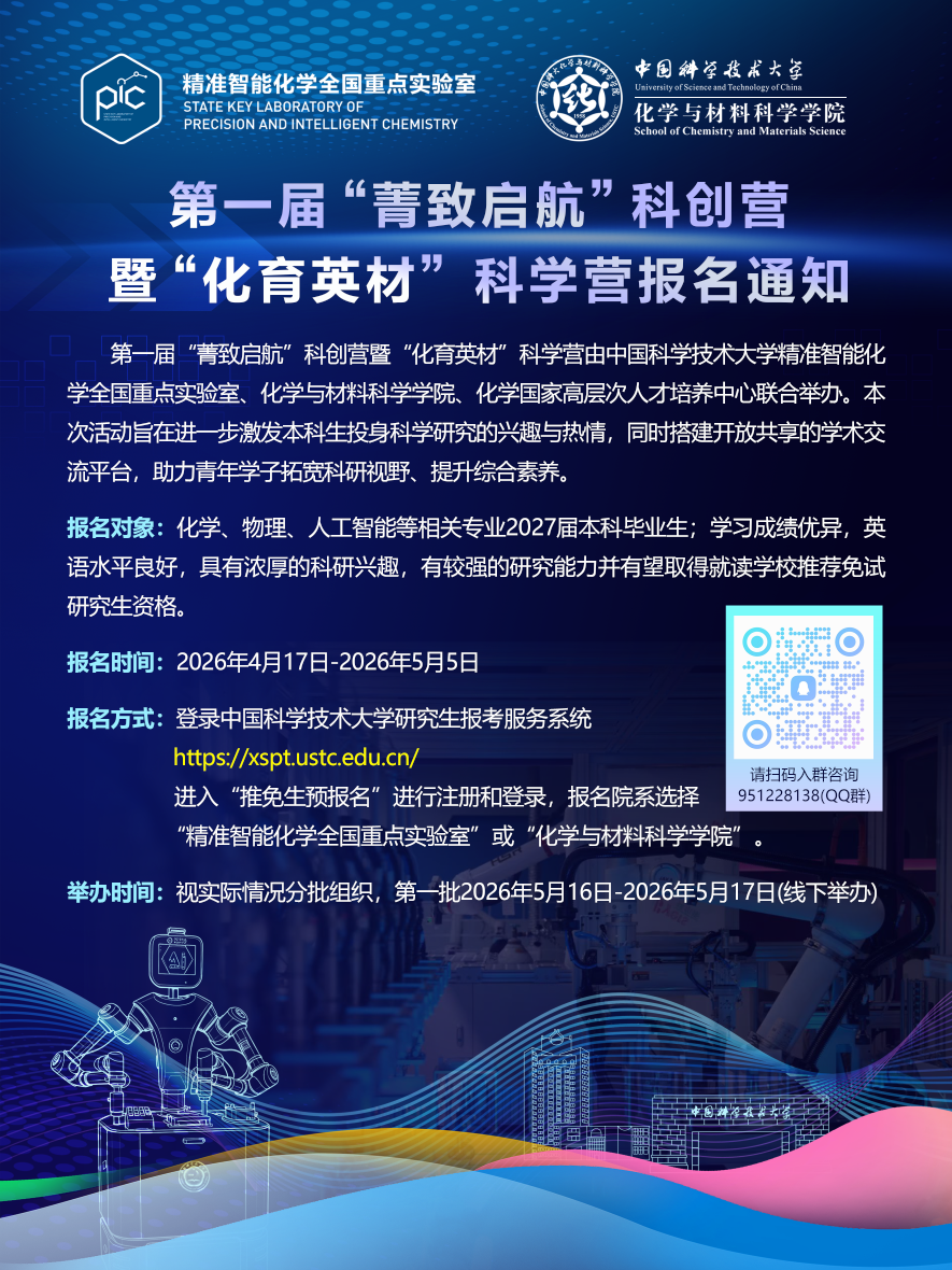 为进一步引导和激发大学生从事科学研究的兴趣和热情,搭建面向本科生的开放交流平台,中国科学技术大学精准智能化学全国重点实验室、化学与材料科学学院、化学国家高层次人才培养中心拟于5月16日-17日联合举办第一届“菁致启航”科创营暨“化育英材”科学营。